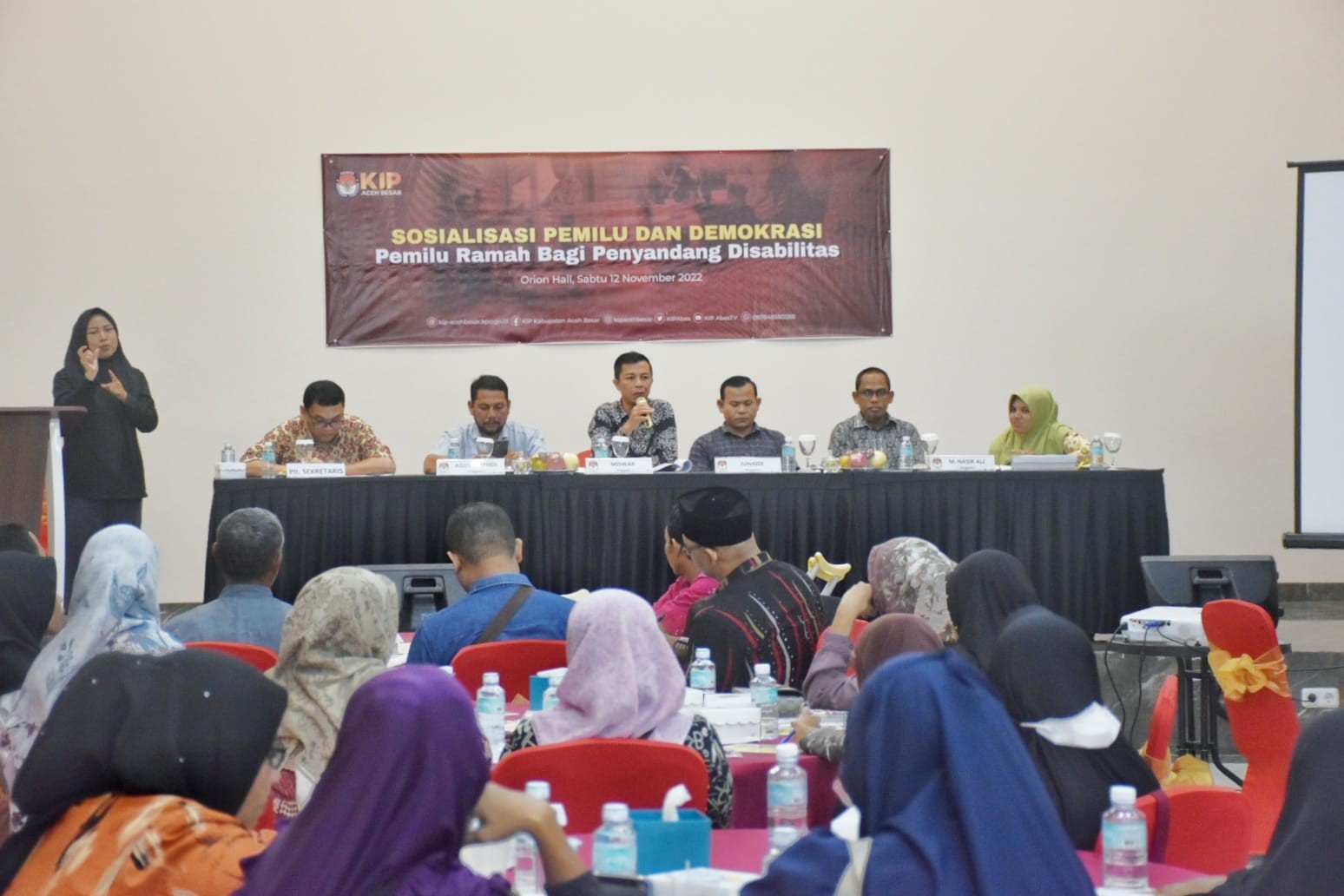 Darul Imarah-Komisi Independen Pemilihan (KIP) Kabupaten Aceh Besar menggelar Sosialisasi Pemilu dan Demokrasi : Pemilu Ramah bagi Penyandang Disabilitas di Orion Hall, Jalan Soekarno-Hatta No. 17, Desa Garot, Kecamatan Darul Imarah, Kabupaten Aceh Besar, Sabtu (12/11/2022)