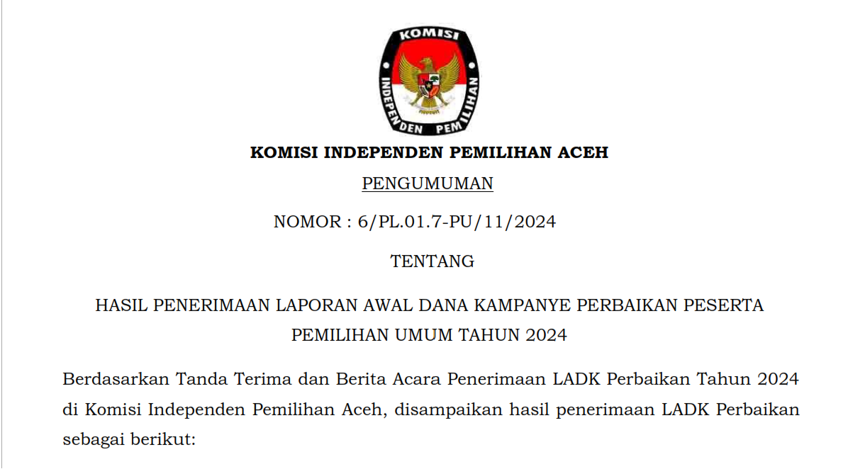 Berdasarkan Tanda Terima dan Berita Acara Penerimaan LADK Perbaikan Tahun 2024 di Komisi Independen Pemilihan Aceh, disampaikan hasil penerimaan LADK Perbaikan sebagai berikut: