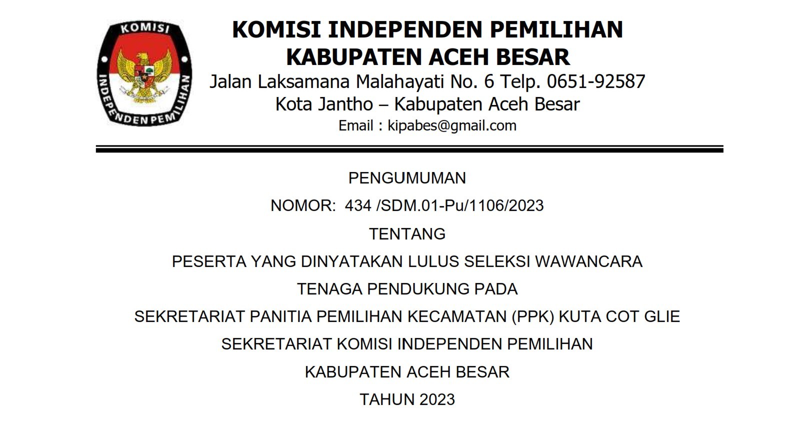 Berdasarkan hasil Seleksi Wawancara Tenaga Pendukung pada Sekretariat Panitia Pemilihan Kecamatan (PPK) Kuta Cot Glie Sekretariat Komisi Independen Pemilihan Kabupaten Aceh Besar Tahun 2023, diumumkan bahwa peserta sesuai lampiran dinyatakan lulus Seleksi Wawancara dan selanjutnya ditetapkan sebagai Tenaga Pendukung pada Sekretariat Panitia Pemilihan Kecamatan (PPK) Kuta Cot Glie Sekretariat Komisi Independen Pemilihan Kabupaten Aceh Besar Tahun 2023. Selengkapnya....