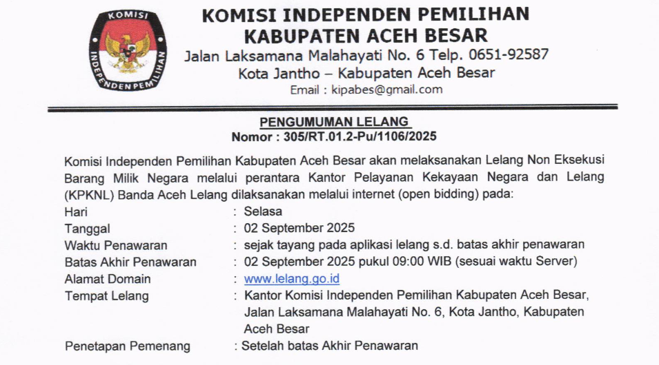 Komisi Independen Pemilihan Kabupaten Aceh Besar akan Melaksanakan Lelang Non Eksekusi Barang Milik Negara (Barang Persediaan Eks Logistik Pasca Pemilihan Tahun 2024) melalui perantara Kantor Pelayanan Kekayaan Negara dan Lelang (KPKNL) Banda Aceh.