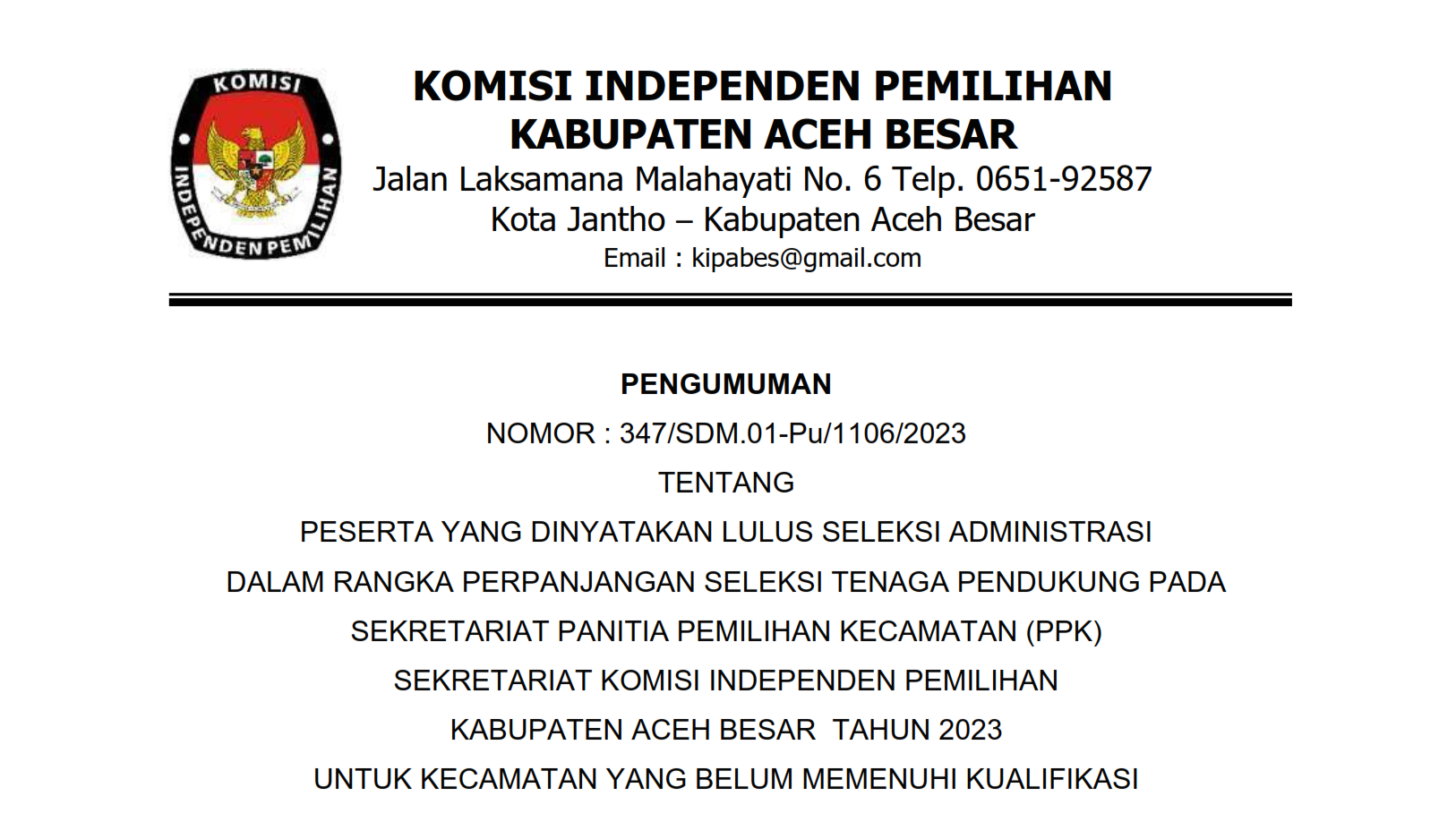 Berdasarkan hasil seleksi berkas pendaftaran yang masuk dalam rangka Seleksi Perpanjangan Tenaga Pendukung Pada Sekretariat Panitia Pemilihan Kecamatan (PPK) Sekretariat Komisi Independen Pemilihan Kabupaten Aceh Besar Tahun 2023 Untuk Kecamatan Yang Belum Memenuhi Kualifikasi, diumumkan bahwa peserta sesuai lampiran dinyatakan lulus Seleksi Administrasi dan selanjutnya dapat mengikuti tes wawancara pada : Selengkapnya....