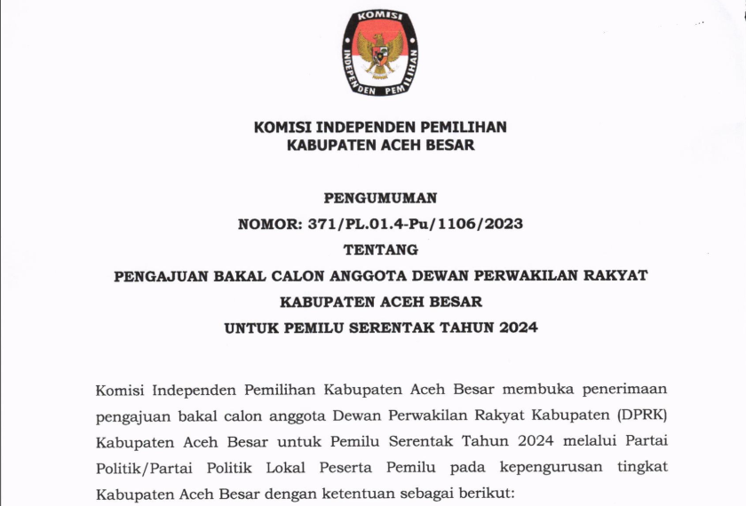 PENGUMUMAN PENGAJUAN BAKAL CALON ANGGOTA DPRK ACEH BESAR UNTUK PEMILU SERENTAK TAHUN 2024