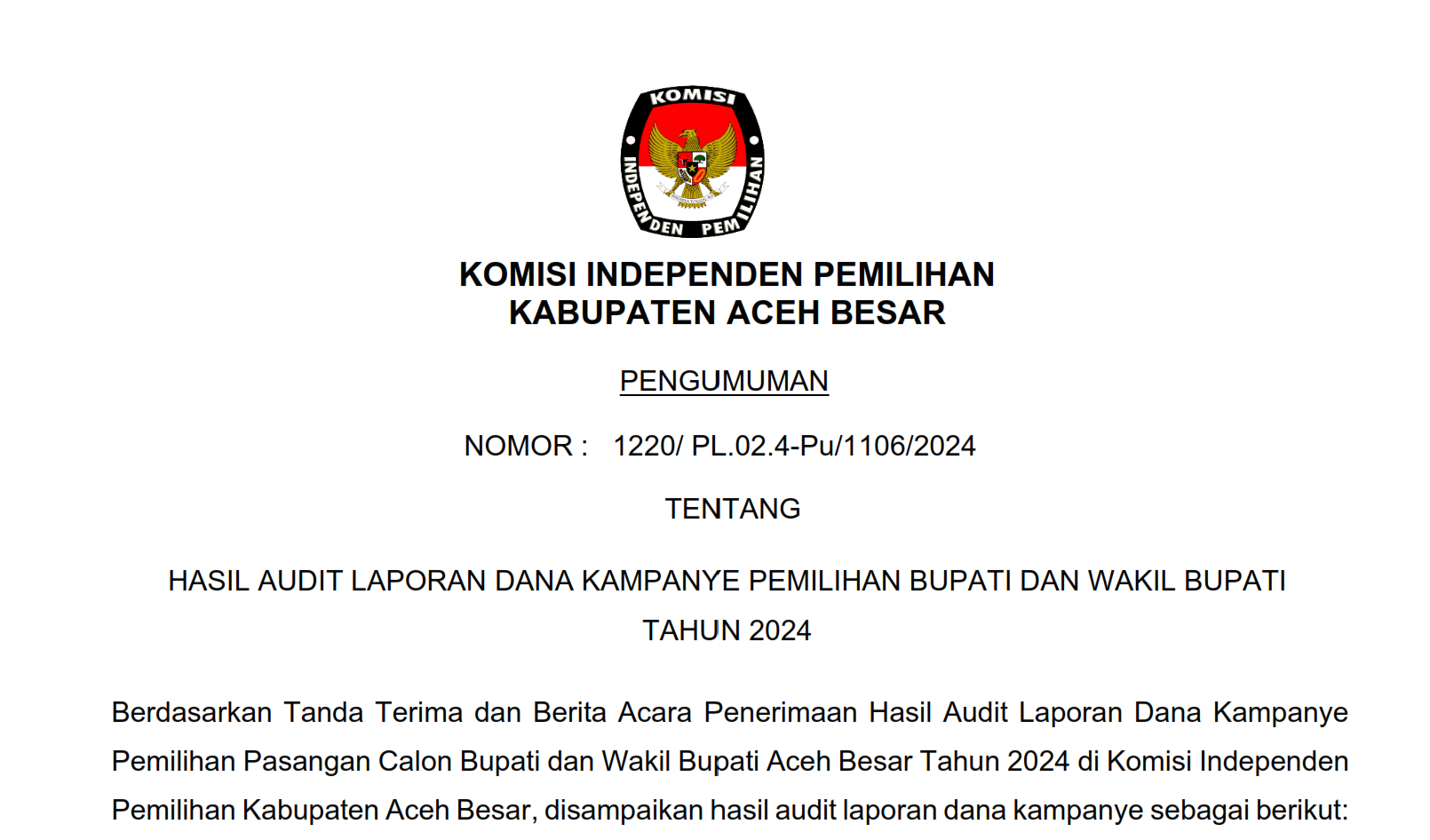 PENGUMUMAN TENTANG HASIL AUDIT LAPORAN DANA KAMPANYE PEMILIHAN BUPATI DAN WAKIL BUPATI TAHUN 2024
