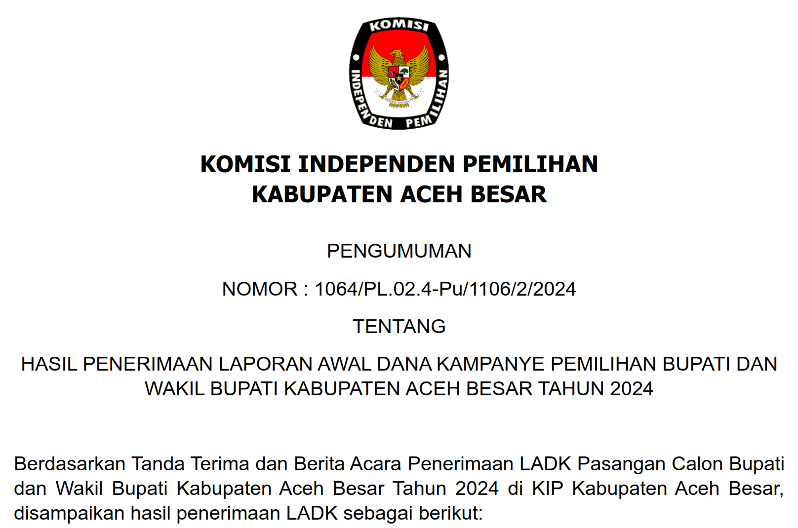PENGUMUMAN TENTANG HASIL PENERIMAAN LAPORAN AWAL DANA KAMPANYE PEMILIHAN BUPATI DAN WAKIL BUPATI KABUPATEN ACEH BESAR TAHUN 2024