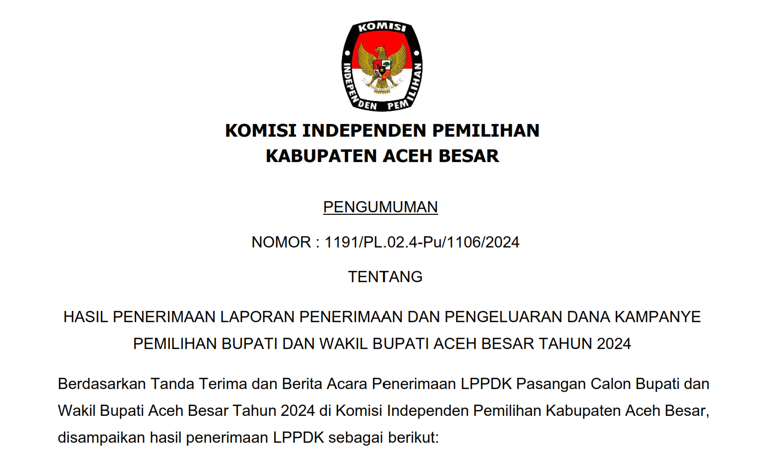 PENGUMUMAN TENTANG HASIL PENERIMAAN LAPORAN PENERIMAAN DAN PENGELUARAN DANA KAMPANYE PEMILIHAN BUPATI DAN WAKIL BUPATI ACEH BESAR TAHUN 2024