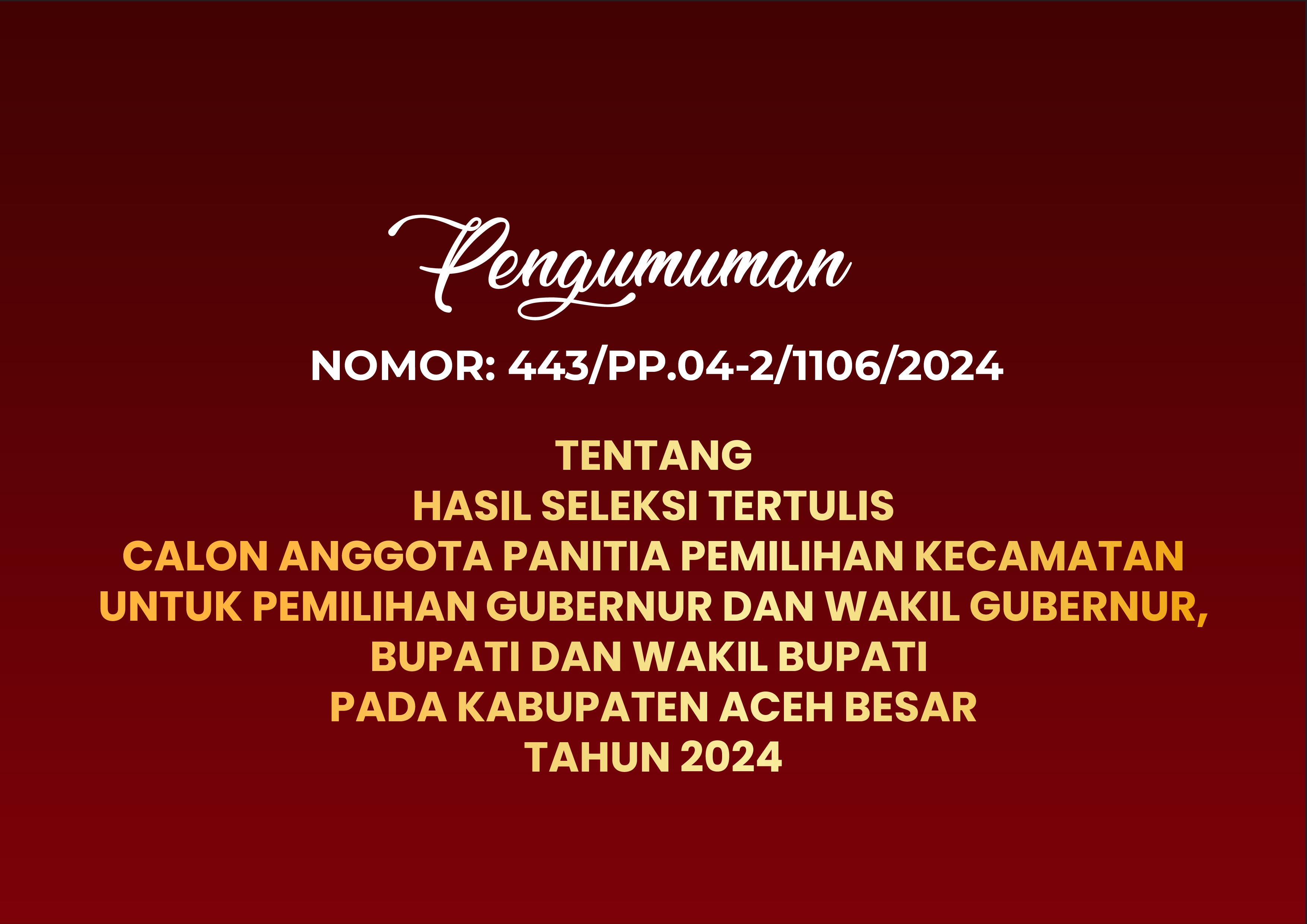PENGUMUMAN TENTANG HASIL SELEKSI TERTULIS CALON ANGGOTA PANITIA PEMILIHAN KECAMATAN UNTUK PEMILIHAN GUBERNUR DAN WAKIL GUBERNUR, BUPATI DAN WAKIL BUPATI PADA KABUPATEN ACEH BESAR TAHUN 2024