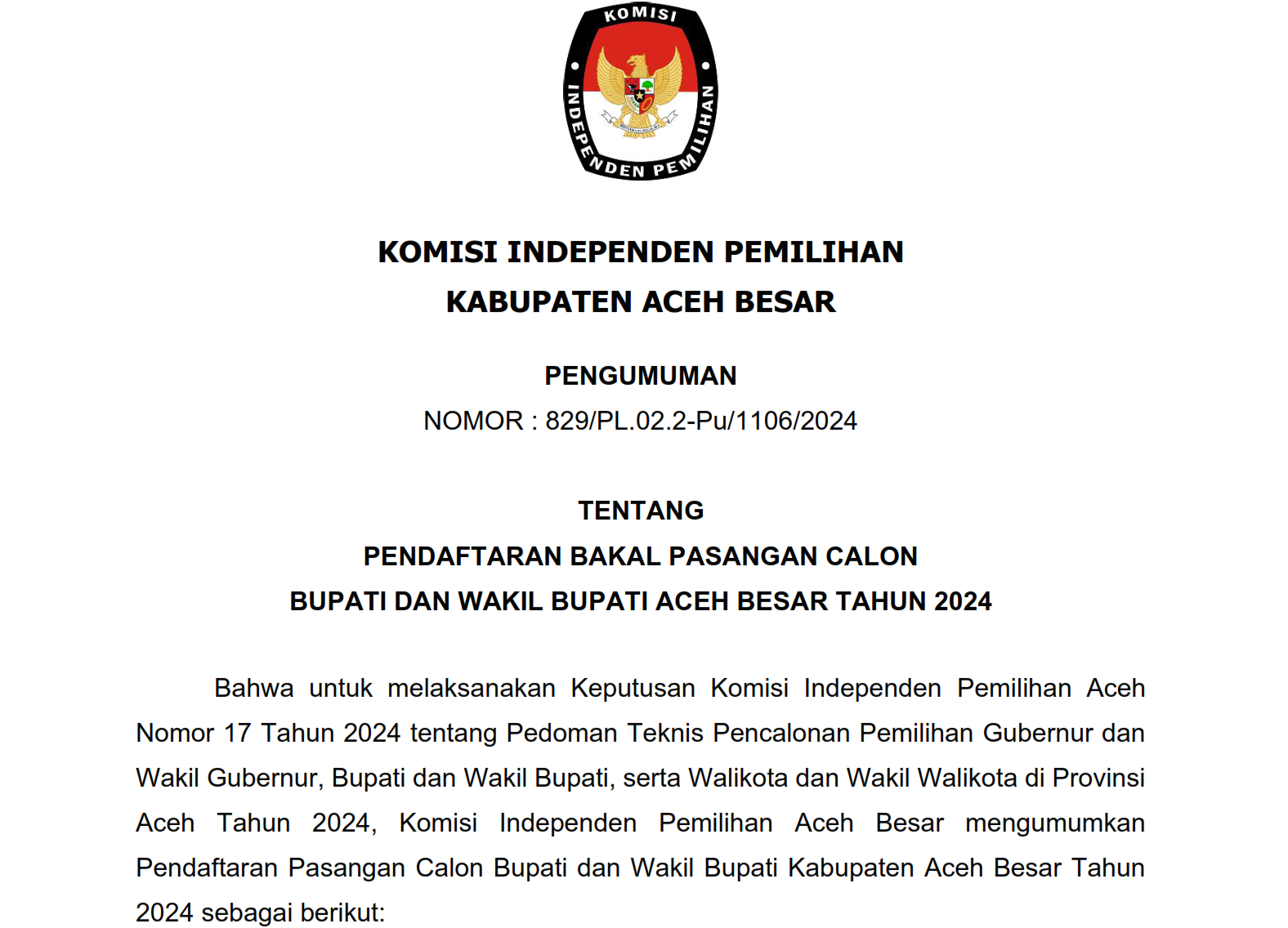 Bahwa untuk melaksanakan Keputusan Komisi Independen Pemilihan Aceh Nomor 17 Tahun 2024 tentang Pedoman Teknis Pencalonan Pemilihan Gubernur dan Wakil Gubernur, Bupati dan Wakil Bupati, serta Walikota dan Wakil Walikota di Provinsi Aceh Tahun 2024, Komisi Independen Pemilihan Aceh Besar mengumumkan Pendaftaran Pasangan Calon Bupati dan Wakil Bupati Kabupaten Aceh Besar Tahun 2024 sebagai berikut: Selengkapnya....