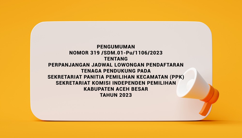 Berdasarkan rekapitulasi hasil seleksi Administrasi Tenaga Pendukung pada Sekretariat Panitia Pemilihan Kecamatan (PPK) Sekretariat Komisi Independen Pemilihan Kabupaten Aceh Besar Tahun 2023 dan memperhatikan belum terpenuhinya kuota jumlah pendaftar Tenaga Pendukung yang dinyatakan Lulus Seleksi Administrasi pada beberapa kecamatan di kabupaten Aceh Besar, maka Sekretariat Komisi Independen Pemilihan Kabupaten Aceh Besar dengan ini menyampaikan Perpanjangan Pendaftaran Tenaga Pendukung Sekretariat Panitia Pemilihan Kecamatan (PPK) Sekretariat Komisi Independen Pemilihan Kabupaten Aceh Besar Tahun 2023 pada unit kerja Sekretariat Panitia Pemilihan Kecamatan sebagai berikut: Selengkapnya...