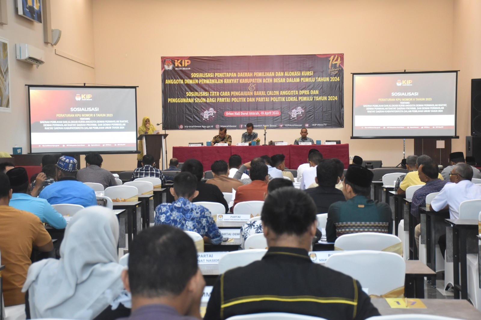 Komisi Independen Pemilihan (KIP) Aceh Besar menggelar Sosialisasi Penetapan Daerah Pemilihan dan Alokasi Kursi Anggota Dewan Perwakilan Rakyat Kabupaten Aceh Besar dalam Pemilu Tahun 2024 dan Sosialisasi Tata Cara Pengajuan Bakal Calon Anggota DPRK dan Penggunaan Aplikasi SILON Bagi Partai Politik dan Partai Politik Lokal Pemilu Tahun 2024, Rabu, (19/04/2023).
