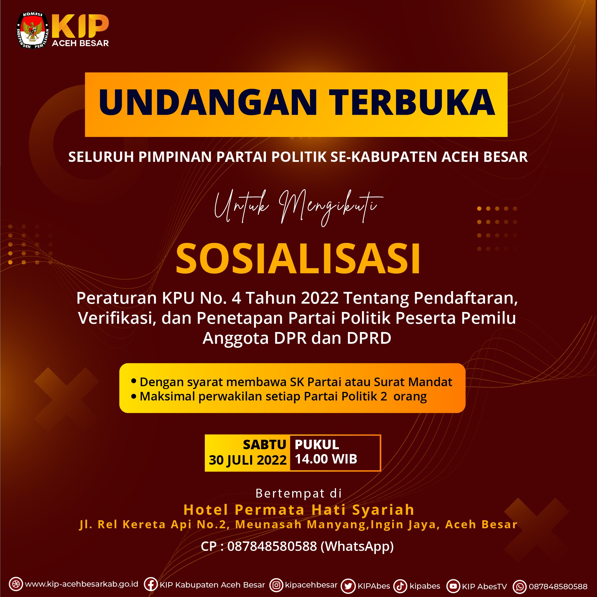 Kepada seluruh pimpinan Partai Politik se-Kabupaten Aceh besar untuk mengikuti sosialisasi "Peraturan KPU No. 4 Tahun 2022 Tentang Pendaftaran, Verifikasi, dan Penetapan Partai Politik Peserta Pemilu Anggota DPR dan DPRD"